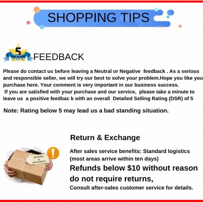 2.Please do not hesitate to contact us to get a better solution before you leave a neutral or negative feedback ,we will do our best to provide you with the best service.